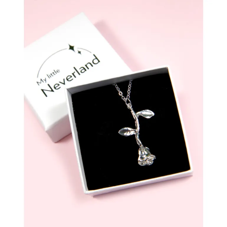 Se trata de un elegante colgante de acero, con acabados plateados, que destaca por una pieza principal con la forma de la Rosa Encantada de La Bella y Bestia, recordando una de las objetos más emblemáticos de esta mágica historia de amor. Cuenta con unos acabados de gran calidad y los detalles más icónicos de esta rosa tan especial.