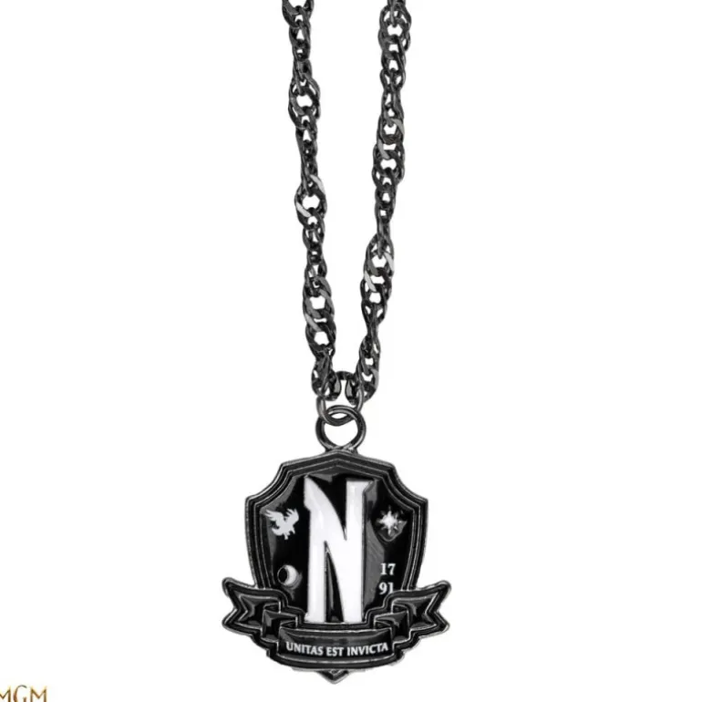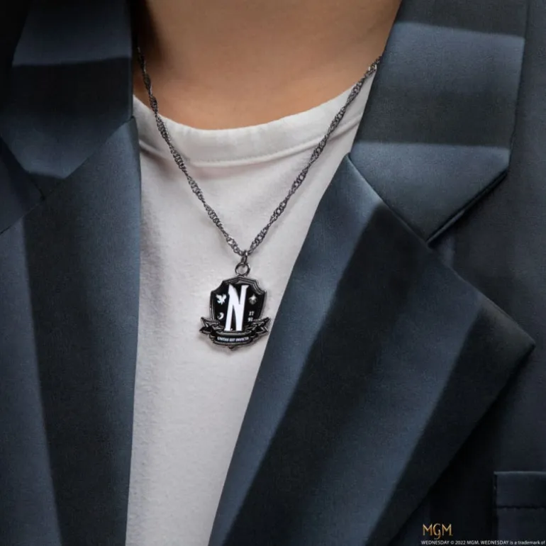 El diseño del colgante incluye una emblemática «N» en el centro, rodeada por detalles intrincados que resaltan su estética gótica. Su tono oscuro combina con cualquier atuendo, añadiendo un toque de misterio y sofisticación.