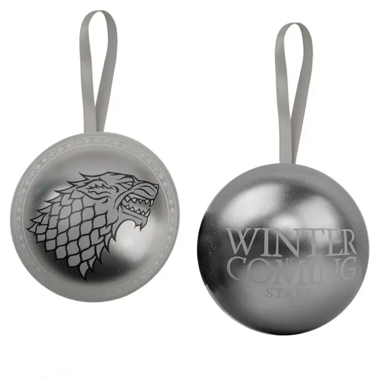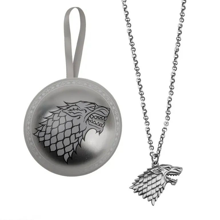 Descubre un exquisito collar Stark de edición navideña inspirado en Juego de Tronos. La pieza central de este conjunto es un colgante metálico con el icónico emblema del lobo huargo de la Casa Stark, acompañado de la célebre frase «Winter is Coming«. Este accesorio se presenta en una elegante cadena que complementa perfectamente su diseño robusto y detallado. El collar viene dentro de una esfera decorativa de color plateado, diseñada con exquisitos detalles que reflejan el prestigio y la historia de la casa Stark. La esfera, de 10 cm de diámetro, es perfecta para adornar tu árbol de Navidad, agregando un toque solemne y sofisticado a tus decoraciones. Este set de colección es un regalo ideal para cualquier amante de la serie, combinando la belleza de un accesorio de moda con el encanto decorativo de una pieza navideña única.