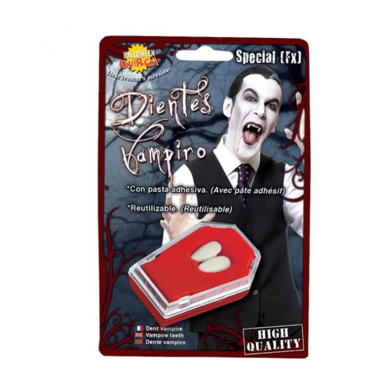 Colmillos de vampiro con pasta adhesiva. Perfecto artículo efectos especiales Fxs para ponértelos con nuestros disfraces de vampiro, vampiresa o Conde Drácula. Ideal en Halloween. Además En tenemos una gran variedad de accesorios y complementos, perfectos para tu disfraz de Halloween, Navidad o Carnaval.