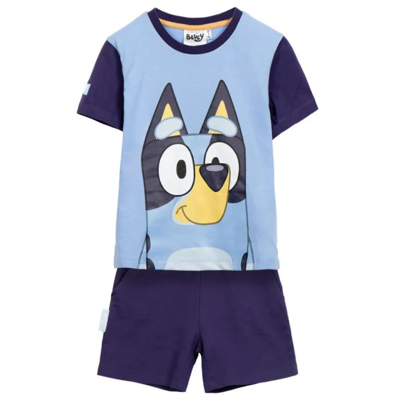 La camiseta luce un alegre color azul claro con detalles en azul oscuro en las mangas y el cuello, y presenta un gran estampado del personaje Bluey en la parte frontal, capturando su esencia juguetona y amigable. Los shorts, en azul oscuro, complementan perfectamente el conjunto, ofreciendo un look coordinado y moderno.