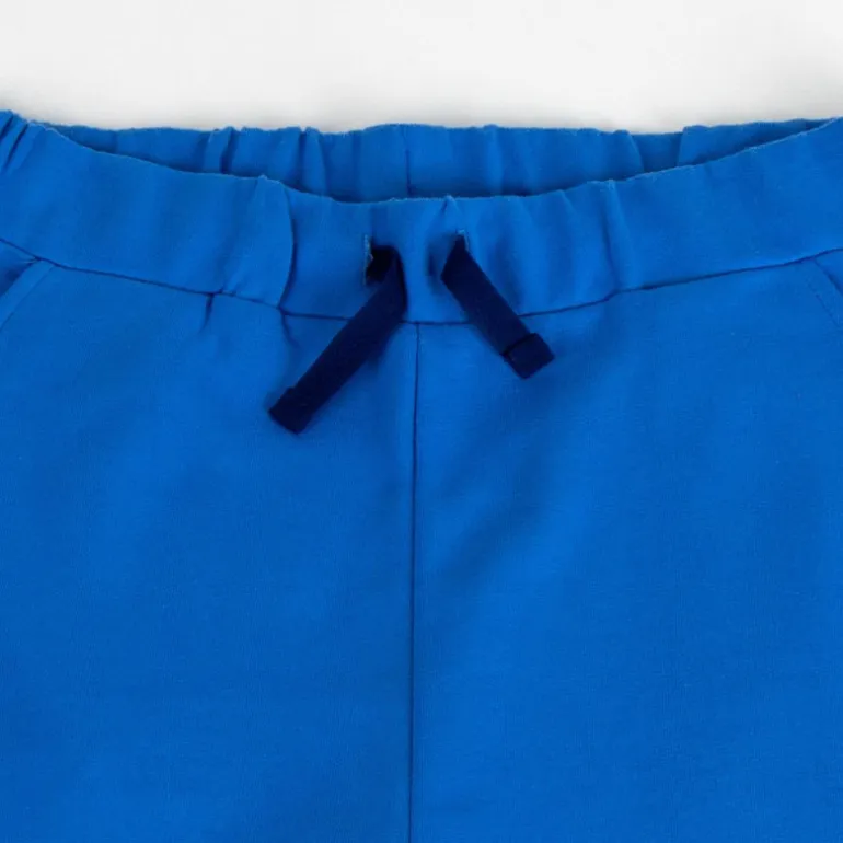 La camiseta es de un llamativo color azul marino, destacando con la imagen de Sonic en el centro y el nombre del personaje en letras grandes y amarillas. Los pantalones cortos, en azul brillante, cuentan con una cintura elástica ajustable con cordón para un ajuste perfecto, proporcionando libertad de movimiento.