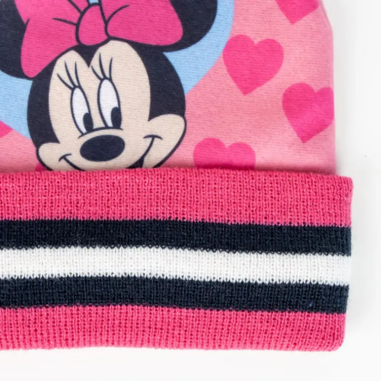 El gorro presenta un diseño atractivo con la imagen de Minnie Mouse, acentuado por un pompón en la parte superior que añade un toque divertido. La parte inferior del gorro tiene un ribete en negro y blanco, que complementa perfectamente el diseño, haciendo que sea versátil y fácil de combinar.