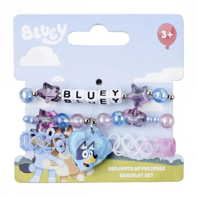 Descubre el encantador conjunto de pulseras Bluey, ideal para los pequeños amantes de la famosa serie de televisión. Este set incluye dos pulseras elásticas multicolor adornadas con cuentas en tonos pastel de rosa, azul y morado, haciendo de este conjunto un accesorio vibrante y llamativo. Una de las pulseras destaca con un colgante en forma de corazón que muestra a Bluey, aportando un toque especial que fascinará a los niños. La otra pulsera cuenta con letras que forman el nombre de ‘BLUEY’, invitando a los pequeños a llevar siempre a su personaje favorito consigo. Fabricadas con un cómodo material elástico, estas pulseras son perfectas para manos pequeñas, asegurando comodidad durante todo el día y estimulando el juego y la creatividad.