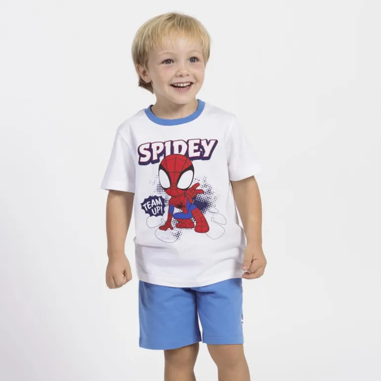 Los pantalones cortos son de un brillante azul, complementando perfectamente la camiseta. Llevan el nombre «Spidey» y un pequeño logo en la pierna, convirtiéndolos en una opción ideal para las aventuras diarias de los más pequeños.