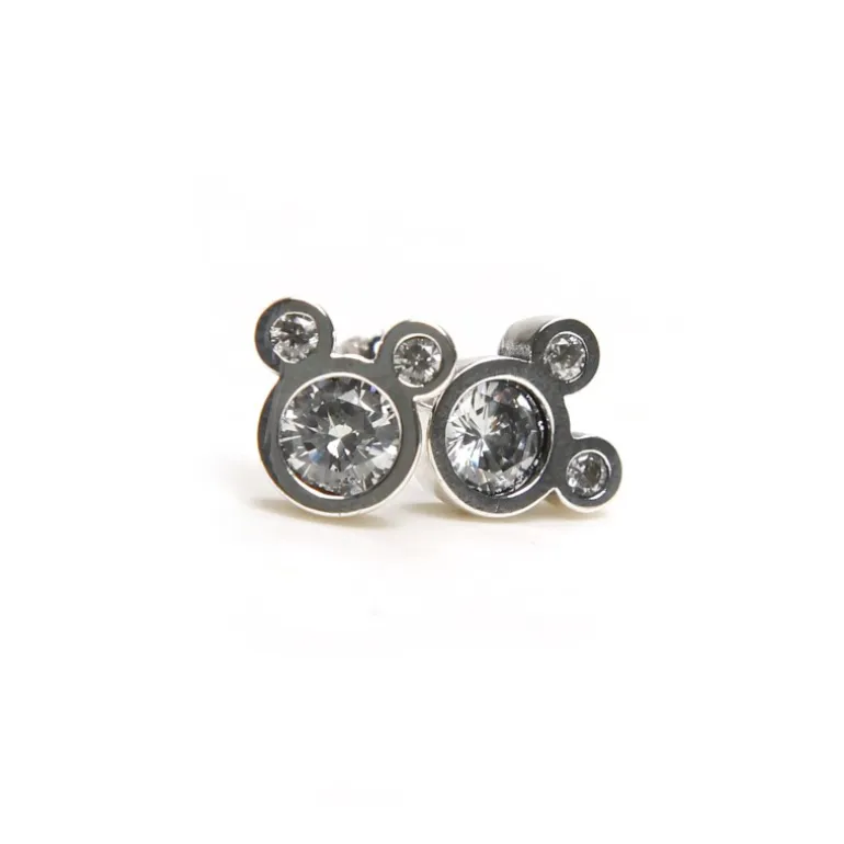Están fabricados en Plata de Ley decorados con brillantes circonitas y tienen la forma característica de la cabeza de Mickey, con esas orejitas inconfundibles. Las pequeñas cabecitas de Mickey miden en torno a 10 x 10 mm y los pendientes son aptos para orejas perforadas.