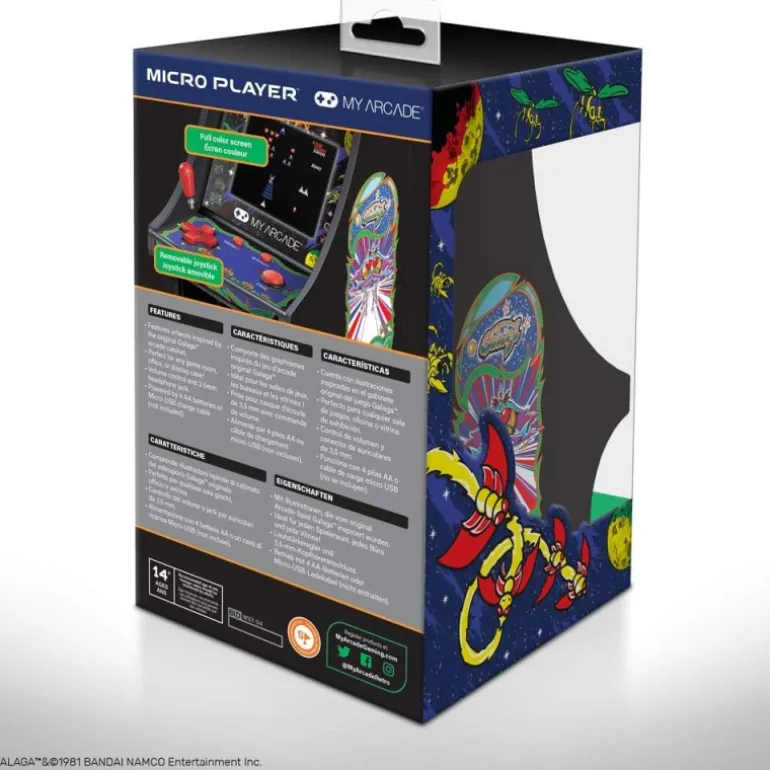 La Consola Micro Player Galaga es una joya del retrogaming ideal para los amantes de los videojuegos clásicos. Con su diseño nostálgico y llamativo, esta mini máquina arcade de 17 cm captura la esencia del icónico juego Galaga.