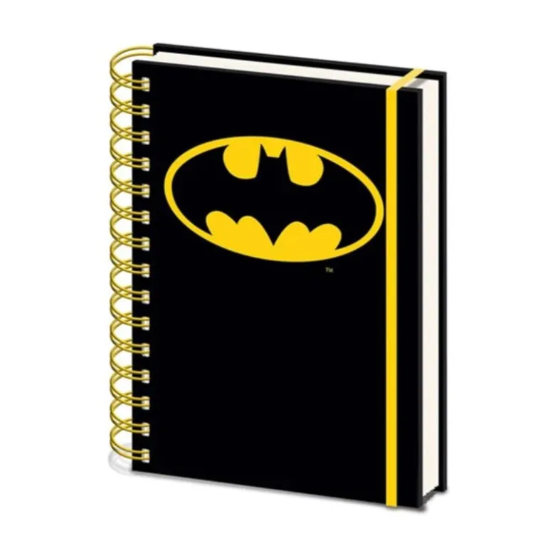 Una maravilla de libreta o cuaderno, de tamaño aproximadamente A5 (15 cm x 21 cm), de tapa dura de cartón plastificado, encuadernación en espiral, y una elegante gomita de color rojo para cerrarla, cuyo diseño está inspirado en Batman, el héroe más oscuro de Gotham y DC Comics.