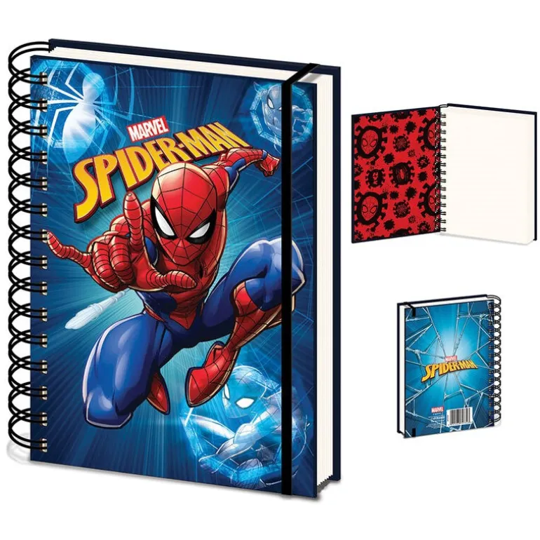 Y es que la portada es todo un homenaje a Spiderman, con un dibujo de este héroe al que le sobra sentido arácnido, a punto de lanzar una de sus típicas telarañas. Es una libreta de tapa dura de cartón, un montón de páginas cuadriculadas en su interior, encuadernación en espiral y una elegante y útil goma para mantenerla cerrada.