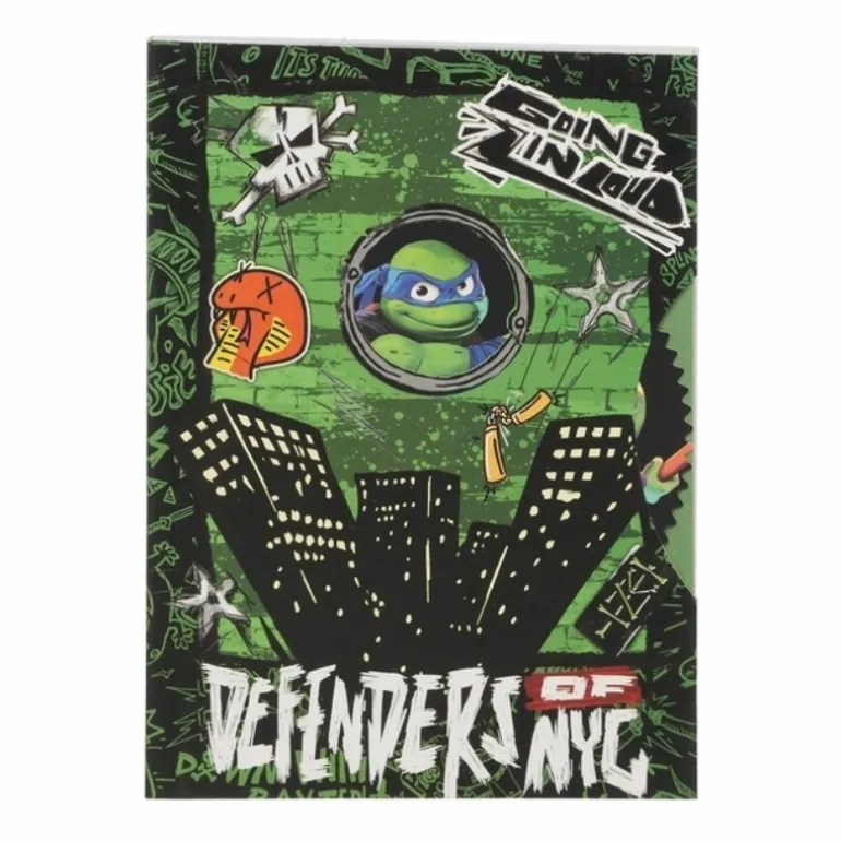 Descubre el excepcional cuaderno A5 Tortugas Ninja Defenders of NYC, una pieza imprescindible para los verdaderos seguidores de estos icónicos personajes. Este cuaderno presenta una portada vibrante en tonos verdes y negros, adornada con ilustraciones de la ciudad de Nueva York bajo la protección de las Tortugas Ninja, y el rostro de uno de los héroes en una ventana destacada.
