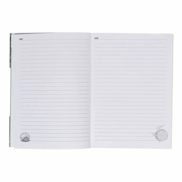 En su interior, este cuaderno de tamaño A5 ofrece páginas rayadas ideales para tomar notas, hacer listas o llevar un diario de aventuras. Cada página está decorada con pequeños motivos de las Tortugas Ninja, añadiendo un toque especial a cada palabra que escribas.