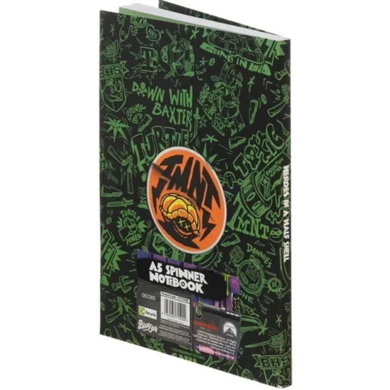 La parte trasera del cuaderno sigue el estilo gráfico con detalles en color negro y verde, mostrando mensajes y símbolos relacionados con las aventuras de las Tortugas Ninja. Sin duda, es un diseño que no pasará desapercibido.