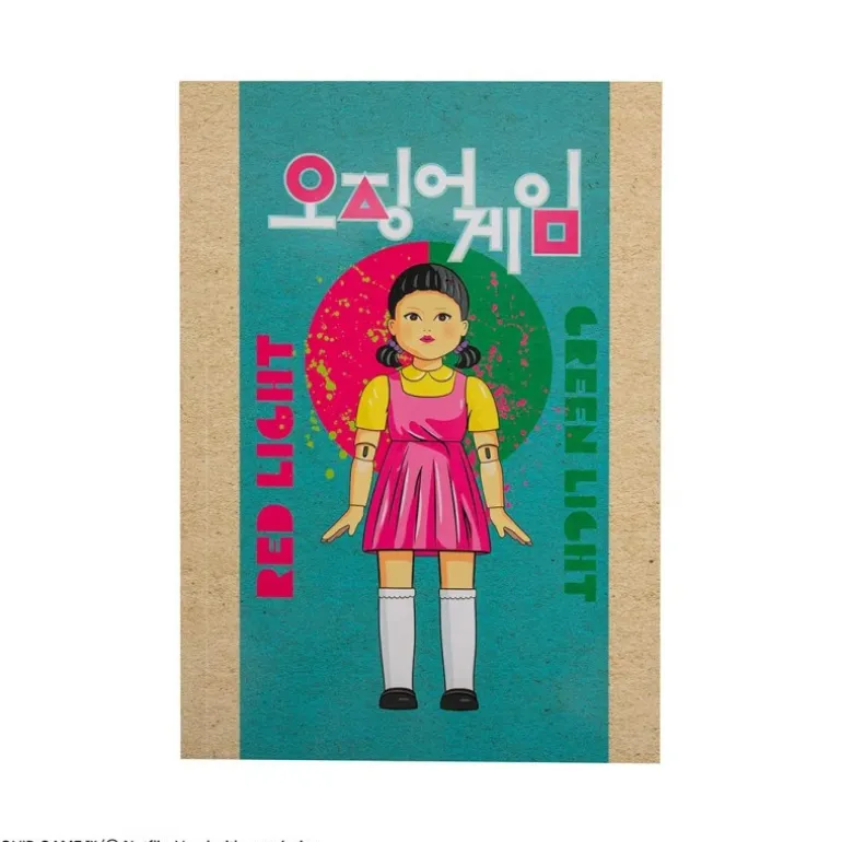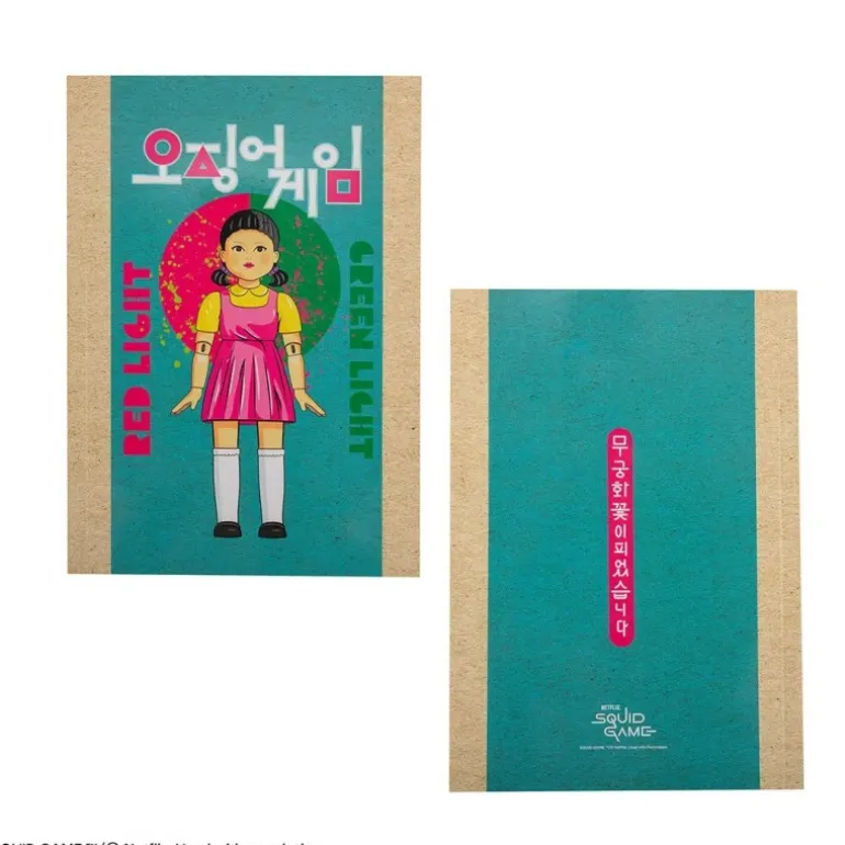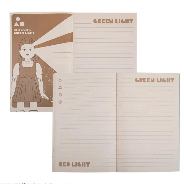 Descubre el Cuaderno Young-hee inspirado en la serie El Juego del Calamar, un artículo imprescindible para los seguidores de la popular serie de Netflix. Este cuaderno tiene unas medidas de 21cm X 15cm X 0,8cm, ideal para llevarlo a todas partes. La portada muestra a la icónica muñeca Young-hee con su característico vestido rosa y fondo azul, acompañado de las palabras «Red Light» y «Green Light» en colores llamativos.