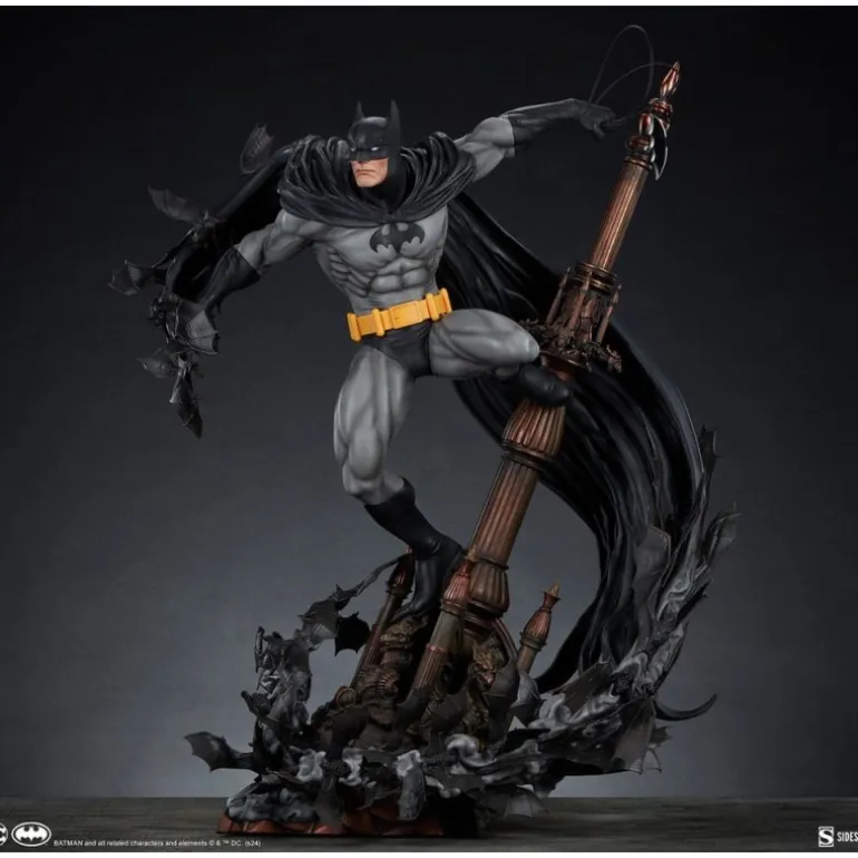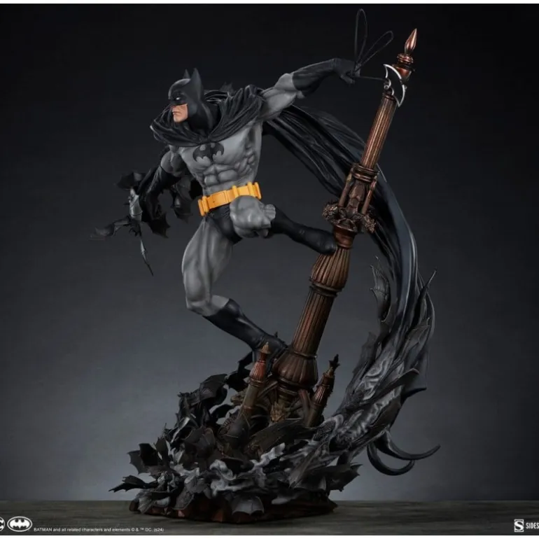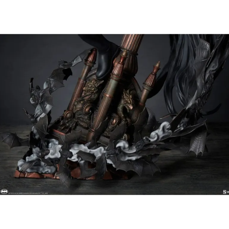 La estatua muestra a Batman en una pose dinámica, destacándose sobre una detallada base que evoca la arquitectura gótica de Gotham City. La atención al detalle es asombrosa, desde el texturizado del traje hasta los pliegues de la capa, todo trabajado con gran esmero para capturar la esencia del icónico caballero oscuro.