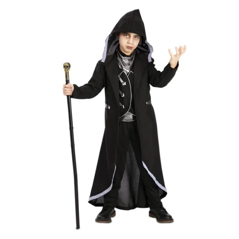 El traje destaca por su elegante color negro, con detalles plateados que acentúan el diseño, brindando un aire sofisticado y mágico. Aunque no se incluyen bastón, pantalones ni calzado, puedes explorar nuestra sección de accesorios para disfraces y completar el look perfecto para tu evento especial.