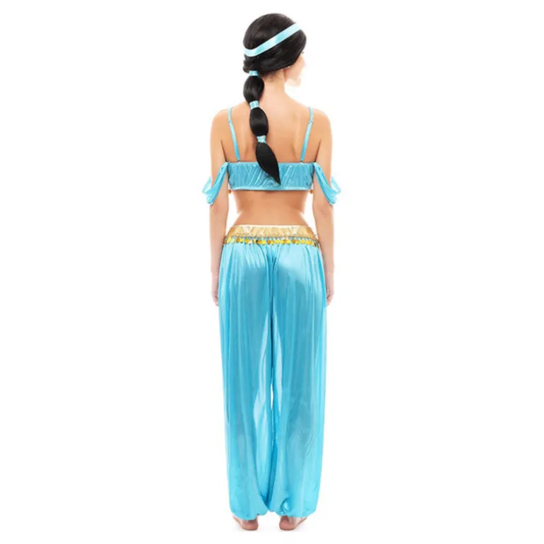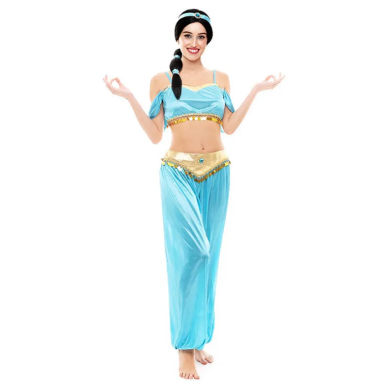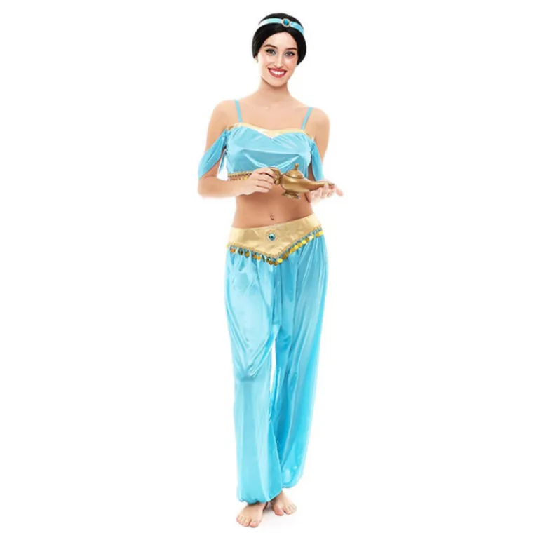 Sumérgete en un mundo de fantasía con este impresionante disfraz de Princesa Árabe. Este traje se presenta en un vibrante color azul celeste, destacando por su diseño elegante y detalles dorados brillantes. Incluye un pantalón suelto que aporta comodidad, y un top de tirantes que realza la figura con delicadeza. El conjunto se completa con un cinturón dorado adornado con pedrería, evocando el glamour y la magia de los cuentos orientales.