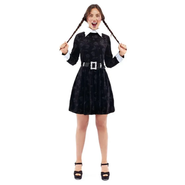 Transforma tu look con este disfraz clásico de Miércoles, ideal para mujeres que buscan un estilo siniestro y auténtico. El conjunto incluye un elegante vestido negro de manga larga con un amplio cuello y puños blancos que crean un contraste llamativo. El diseño del vestido se completa con un cinturón negro con hebilla plateada que realza la cintura.