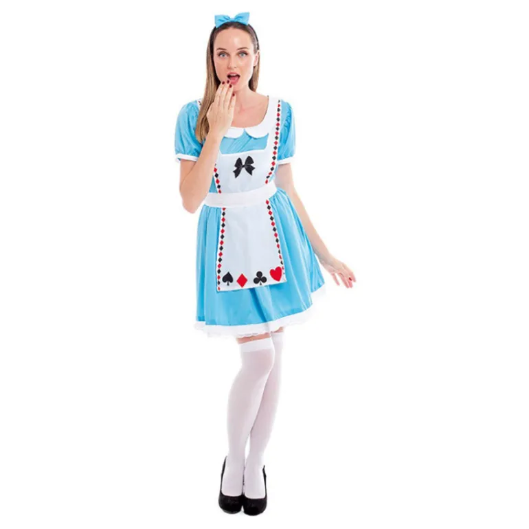 El vestido es de un azul cielo vibrante, con mangas cortas abombadas y un elegante cuello blanco que le añade un toque clásico. El delantal blanco luce detalles de símbolos de naipes en negro y rojo, dándole un estilo único y auténtico. Además, una delicada diadema complementa a la perfección el look, asegurando que cada detalle esté cuidado hasta el más mínimo detalle.