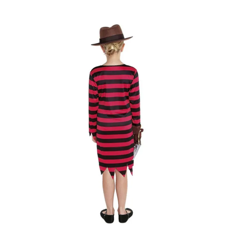 Convierte a tu pequeña en la protagonista de sus historias de Halloween con el disfraz de Asesina de Pesadilla. Este disfraz incluye un vestido llamativo con un diseño de rayas rojas y negras, que se adapta perfectamente al tema tenebroso. Las rayas son horizontales y el vestido tiene un corte irregular al final, añadiendo un toque auténtico y espeluznante.