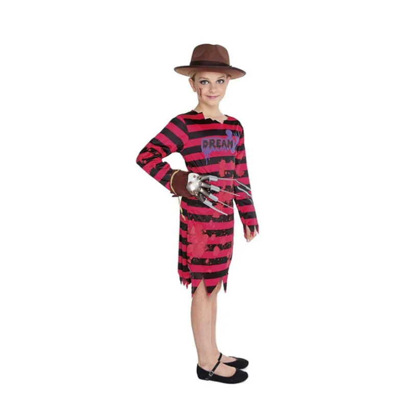 El vestido lleva impresa la palabra «Dream» con un diseño goteante que simula sangre, dándole un aire aún más aterrador y divertido para las fiestas de disfraces. Aunque el disfraz no incluye sombrero, guante ni calzado, puedes complementar el look completo con accesorios adicionales.