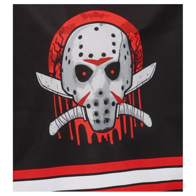 Convierte a tu pequeño en el terror de las fiestas con este impactante disfraz de asesino de hockey. Diseñado especialmente para los más atrevidos, este conjunto incluye una máscara blanca con detalladas perforaciones que evocan el clásico look de un jugador de hockey misterioso. La camiseta negra complementa el disfraz con un estampado frontal de una máscara con cuchillos cruzados, acentuado por detalles en rojo y blanco que le dan un toque dramático.