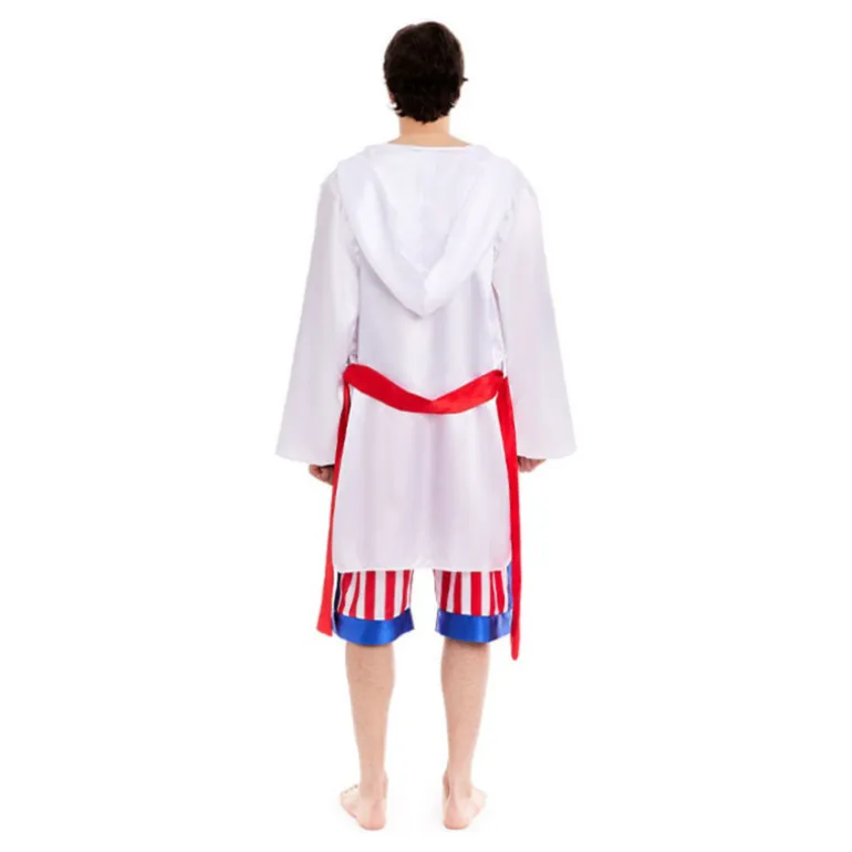 Transforma cualquier ocasión en una experiencia cinematográfica con el disfraz de boxeador Rocky para hombre. Este conjunto incluye una bata blanca larga con capucha, perfecta para recrear el icónico look de Rocky Balboa. El cinturón rojo añade un toque auténtico, ajustando la bata a la perfección.