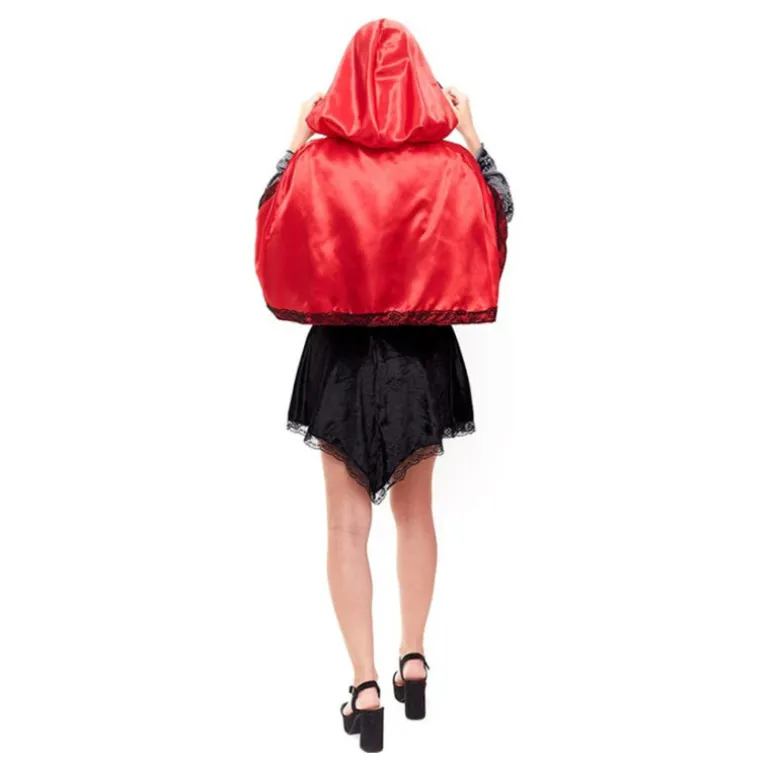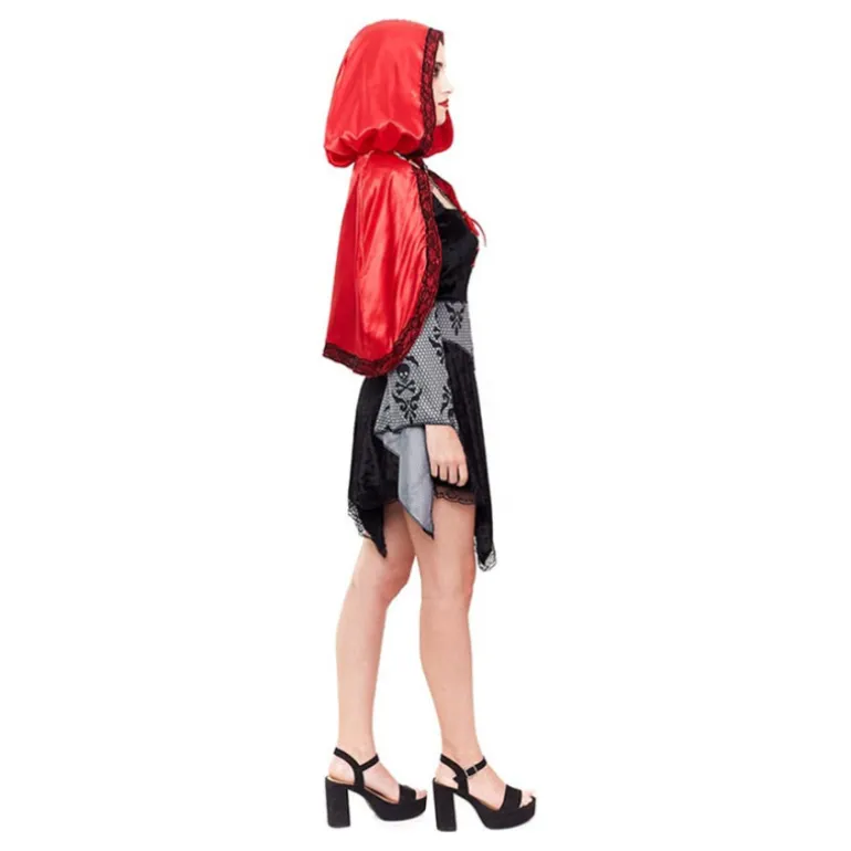 Transforma el clásico cuento de hadas con un toque oscuro con este impresionante disfraz de Caperucita Gótica para mujer. El conjunto incluye un vestido negro con detalles en encaje y un patrón de calaveras, que le da un aspecto misterioso y elegante. La capa roja de satén, con un interior estampado, aporta un contraste vibrante y complementa perfectamente el estilo gótico.