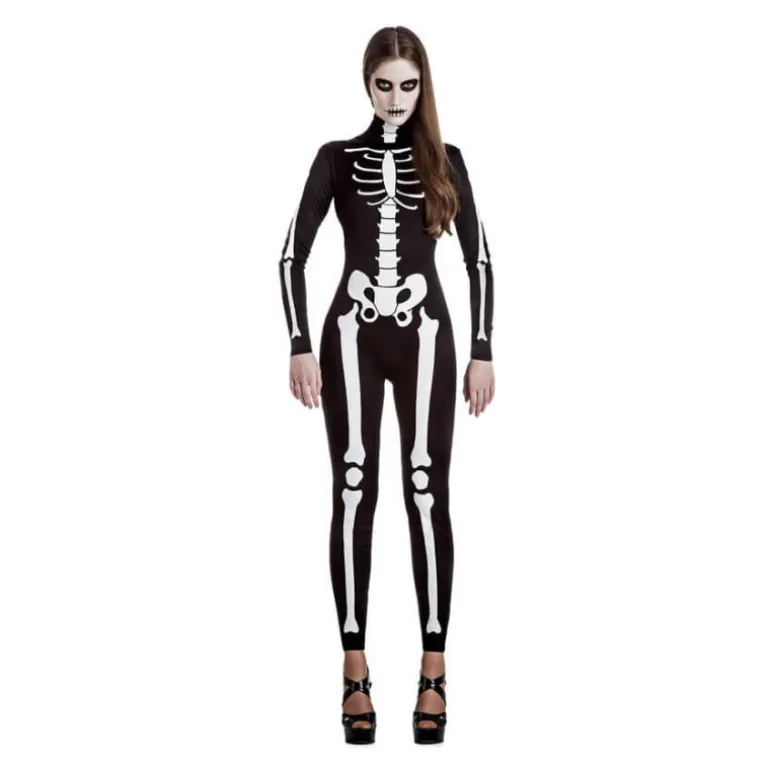Disfraz de Esqueleto Mujer para mujer en varias tallas. Incluye Mono impreso solo por delante con lazo en la parte de arriba para ajustar. Perfecto para Halloween y fiestas de terror.