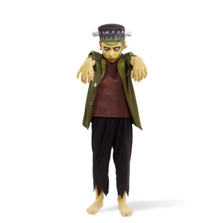 El gorro es de color negro con detalles en forma de tuercas plateadas a los lados, simulando los conocidos pernos del monstruo. La camiseta, de un color marrón oscuro, se acompaña de un chaleco verde oliva, ambos con un diseño que refleja el estilo destartalado y clásico de Frankenstein. Los pantalones, de color negro, tienen un acabado irregular en los tobillos para añadir autenticidad al disfraz.