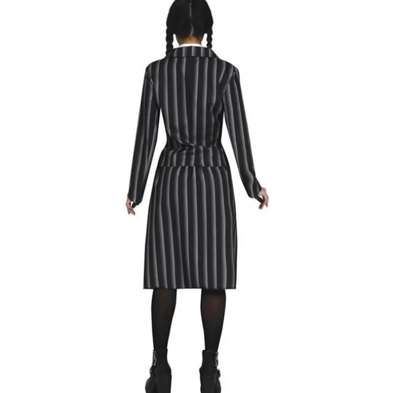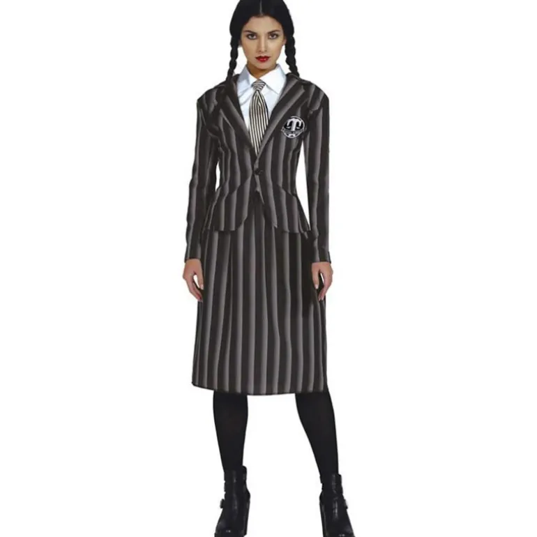 La combinación de prendas en este disfraz evoca la imagen de una estudiante gótica, con un look único y llamativo que no pasará desapercibido. La chaqueta aporta un toque formal y elegante, la camisa con corbata añade un toque de sofisticación y la falda de cuadros un toque juvenil y rebelde.
