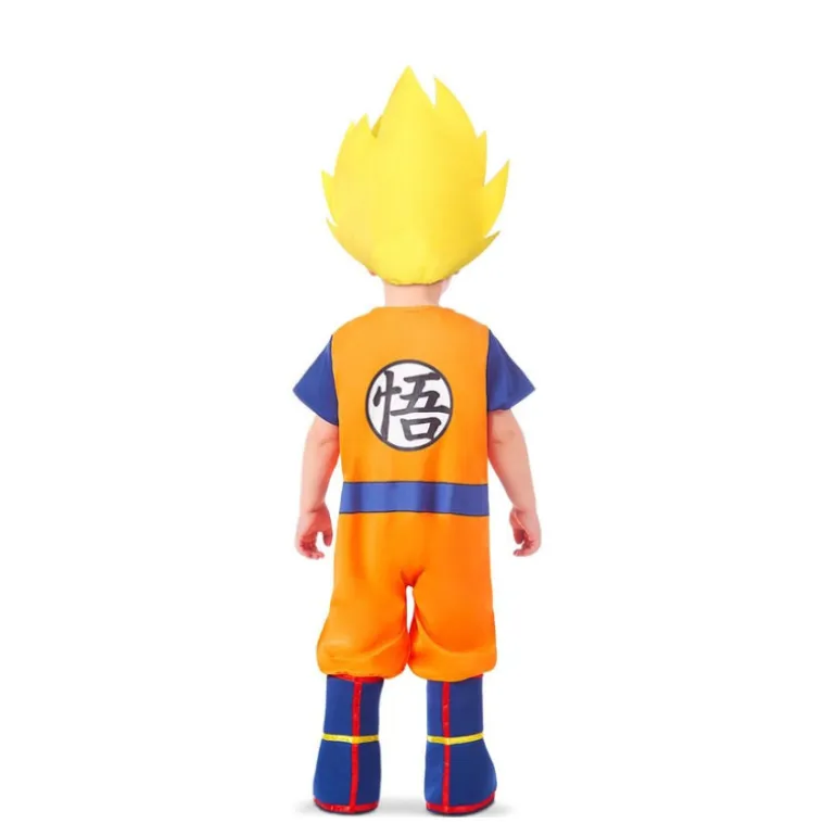 Transforma a tu pequeño en el icónico héroe de Dragon Ball con este **disfraz de Goku** especialmente diseñado para bebés. Este conjunto, inspirado en el traje clásico, incluye un body de color naranja vibrante con detalles azules, una peluca textil amarilla simulando el característico cabello en punta de Goku, y unos cómodos cubrebotas azules con detalles en rojo y amarillo.