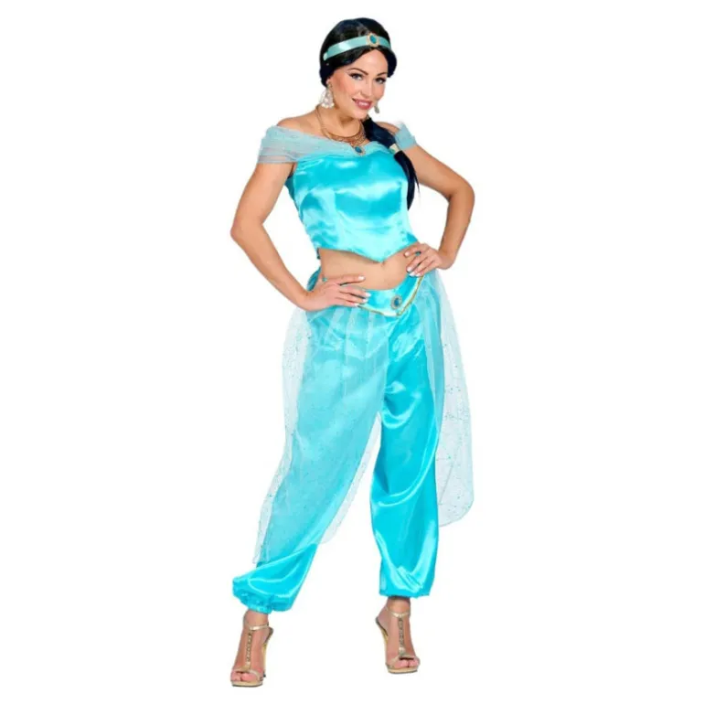Transforma tu vestuario con este Disfraz de Jasmine para mujer, ideal para fiestas de disfraces, Carnaval o cualquier evento temático. Este encantador conjunto incluye un top de color azul turquesa brillante, diseñado para llevarse al estilo hombros descubiertos, añadiendo un toque de elegancia y autenticidad a tu atuendo. Está acompañado por un pantalón a juego, de corte holgado y también en azul turquesa, que incorpora un delicado velo transparente con detalles brillantes, dándole un aire majestuoso.