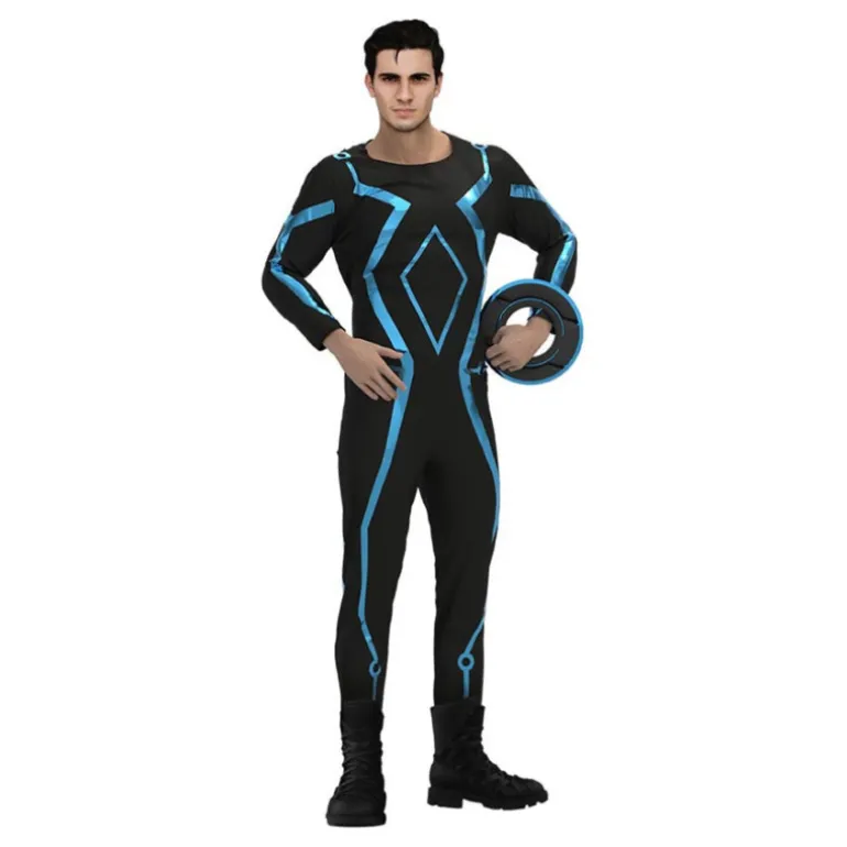 Este impresionante disfraz de jugador de videojuegos combina colores negro y azul en un diseño audaz y atractivo. El traje es un maillot enterizo que cubre el cuerpo con líneas y formas geométricas en azul, creando un efecto visual futurista y dinámico. Perfecto para eventos temáticos, fiestas de disfraces o convenciones de videojuegos.
