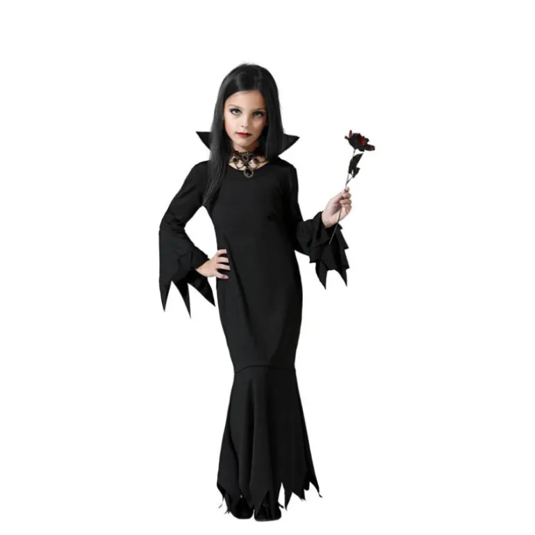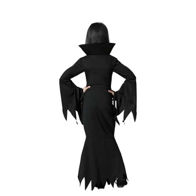 Este elegante disfraz de Madre Tenebrosa para niña es perfecto para Halloween o cualquier fiesta temática. Incluye un vestido largo de color negro que destaca por su diseño dramático y sofisticado. El vestido tiene mangas largas con detalles acampanados y un cuello en alto que aporta un aire misterioso. Los bordes irregulares del vestido añaden un toque gótico ideal para un look tenebroso. Hecho con materiales cómodos y ligeros, garantiza libertad de movimiento para las pequeñas aventureras. *No incluye rosa ni calzado.*