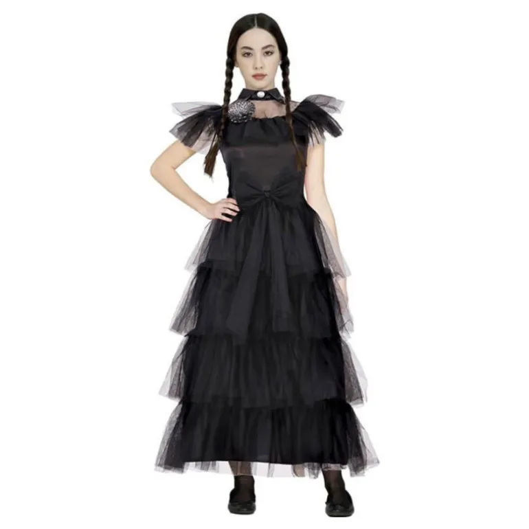 Este disfraz está inspirado en un look icónico y es perfecto para adolescentes que buscan destacar en cualquier evento temático. El vestido negro presenta un diseño de capas con volantes de tul, proporcionando una apariencia elegante y siniestra. Las mangas cortas y abombadas añaden un toque único y sofisticado, mientras que el lazo en la cintura realza la figura.