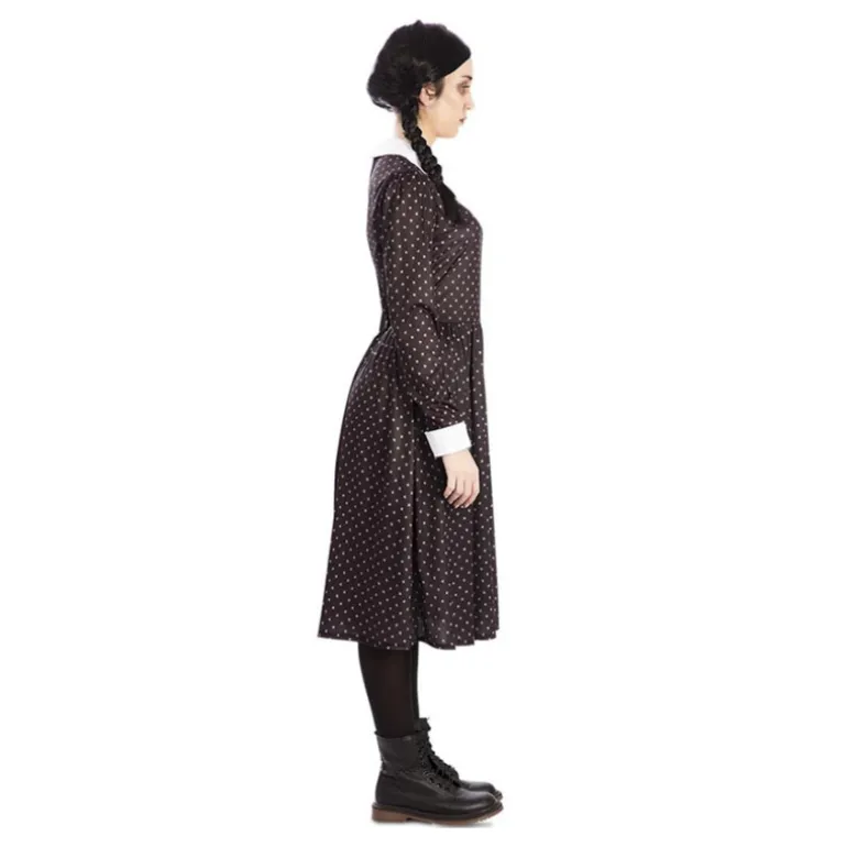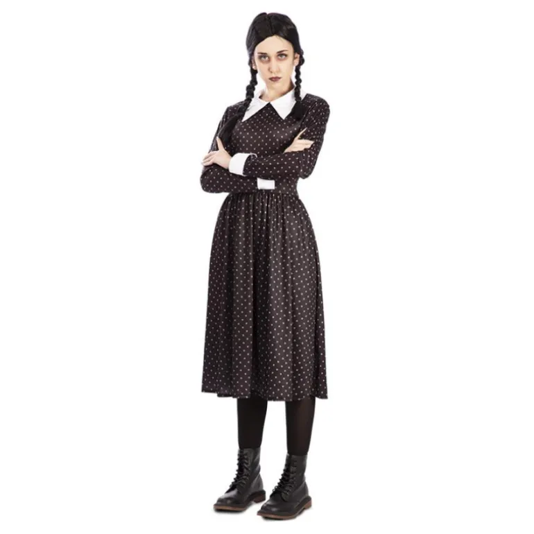 Sumérgete en un estilo oscuro y sofisticado con este disfraz de niña gótica para mujer. El conjunto incluye un encantador vestido de color negro adornado con pequeños puntos blancos, que resaltan su diseño clásico y atemporal. El vestido se caracteriza por su corte midi, ajustado en la cintura para definir la silueta, y con un cuello y puños blancos que le dan un toque distintivo.