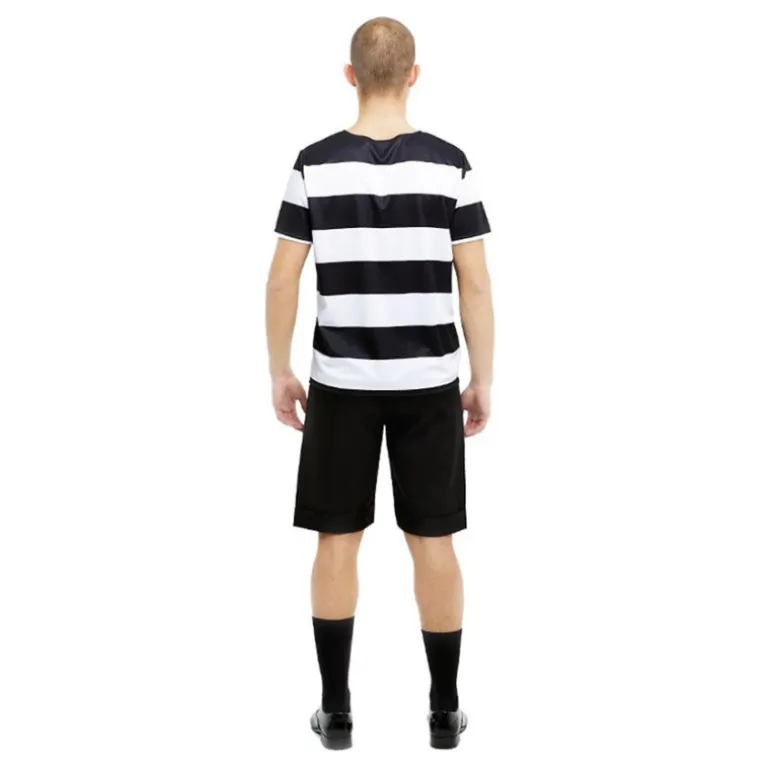 Transforma cualquier celebración en una experiencia única con el Disfraz de Niño Tenebroso para Hombre. Este conjunto incluye una llamativa camiseta y pantalones a juego. La camiseta presenta un diseño de rayas horizontales en blanco y negro, con un detalle de calavera en el pecho, añadiendo un toque misterioso y temático. Los pantalones cortos en negro complementan perfectamente el look, proporcionando comodidad y estilo.