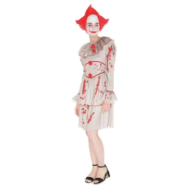 Transfórmate en el personaje más escalofriante de la pantalla con este disfraz de Pennywise IT para mujer. El conjunto incluye un vestido de color gris claro con detalles en rojo, simulando salpicaduras que evocan la tenebrosa apariencia del famoso payaso. El vestido presenta un diseño de volantes en los hombros y cuello, típico del personaje, que se complementa con un cuello desmontable para mayor realismo.