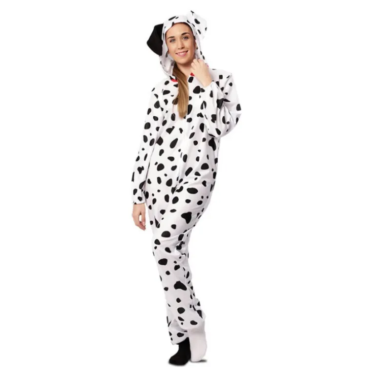 Sumérgete en el mundo de la diversión con este encantador Disfraz de Perro Dálmata para adultos. Este maillot enterizo de color blanco presenta un diseño clásico de manchas negras que simulan el patrón característico de los dálmatas, perfecto para eventos temáticos o carnavales. El disfraz incluye una capucha con orejas de perro que añade un toque adorable y auténtico a tu atuendo.