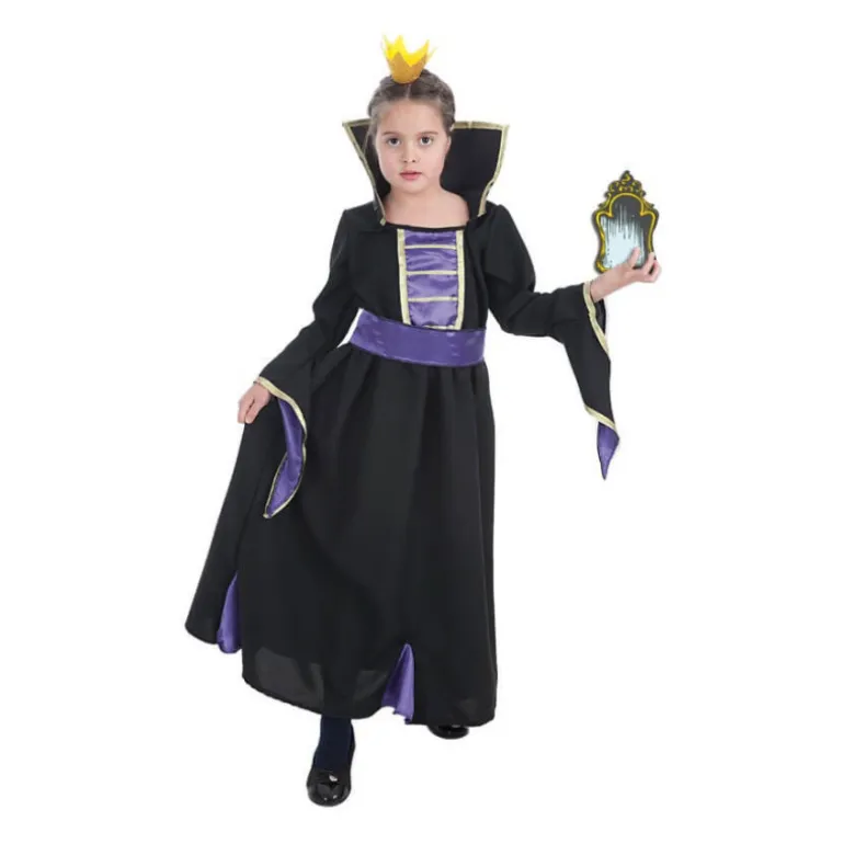 Disfraz de Reina Malvada para niña. Incluye falda, fajín, camisa con cuello y corona. NO incluye espejo, medias ni calzado. Completa este disfraz con artículos de la sección de accesorios como peluca, joyas, cetro, corona o maquillaje. En la tabla de medidas debes mirar en la colección diamante. Hecho en España. ¡Si no te gusta tienes 14 días para su devolución!