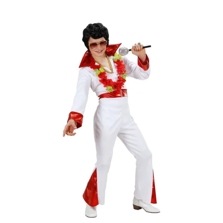 Sumérgete en el estilo único del icónico Rey del Rock and Roll con este impresionante disfraz. El atuendo destaca por su vibrante maillot blanco adornado con deslumbrantes detalles en rojo metálico en el cuello, los puños y las perneras. Este diseño audaz captura la esencia del rock clásico y garantiza que te roben todas las miradas en cualquier evento.