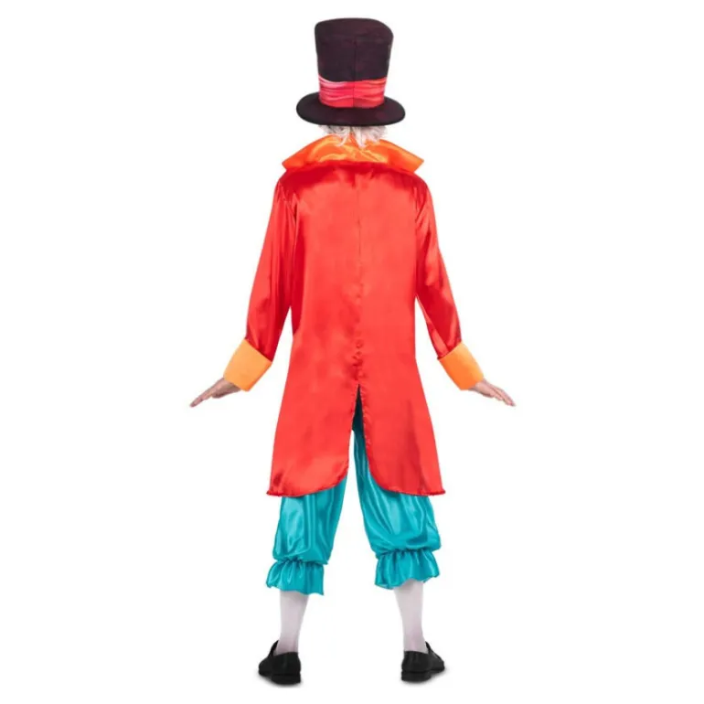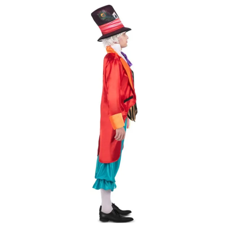 Transforma cualquier evento en una experiencia inolvidable con este disfraz de Sombrerero Loco ideal para los amantes de los clásicos. El conjunto incluye un llamativo sombrero negro adornado con una vistosa cinta roja, una carta de póker y una pluma de pavo real, que exuda originalidad y estilo. Completa el look con un cuello con pajarita de color morado y una chaqueta larga de un intenso color naranja, que junto al chaleco enfatiza un diseño de rayas negras y amarillas.