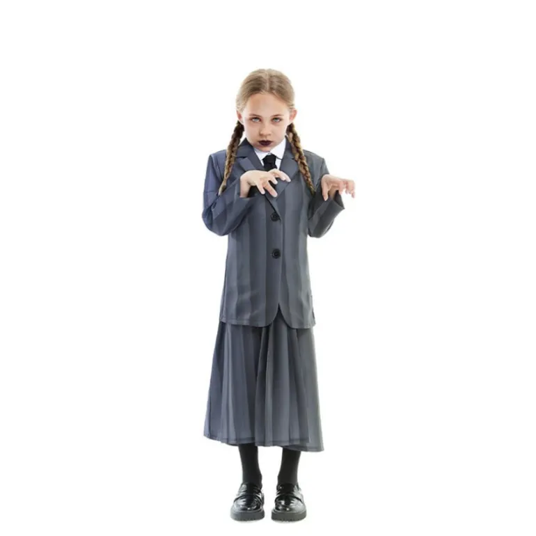 Sumérgete en el misterioso mundo de Miércoles Addams con este disfraz de uniforme a rayas diseñado especialmente para niñas y adolescentes. El conjunto incluye una elegante chaqueta de solapas clásicas y botones frontales, combinada con una falsa camisa blanca que aporta un toque tradicional. La falda a juego es larga y fluida, proporcionando comodidad y movimiento.