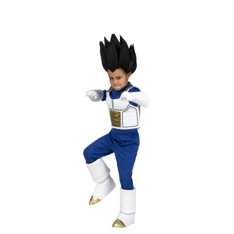 Transforma a tu pequeño en el orgulloso príncipe Saiyan con este increíble disfraz de Vegeta. El conjunto se compone de una vibrante camiseta azul con detalles en blanco y dorado, un chaleco que simula la armadura característica del personaje, pantalones azules, elegantes cubrebotas blancos y unos guantes a juego. Aunque el disfraz no incluye peluca, es una pieza auténtica de licencia oficial de Dragon Ball, asegurando calidad y diseño fiel al anime.