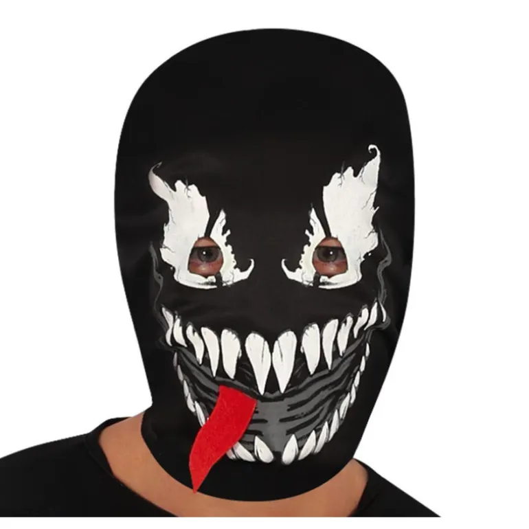 Conviértete en el misterioso héroe arácnido Venom con este impresionante traje oscuro. El disfraz incluye una capucha que cubre completamente la cabeza, decorada con un diseño impactante de ojos blancos y una boca llena de colmillos afilados, añadiendo un toque de peligro y misterio a tu apariencia. El maillot enterizo es completamente negro, destacando un audaz diseño arácnido en blanco en el pecho, perfecto para causar furor en cualquier evento de disfraces.