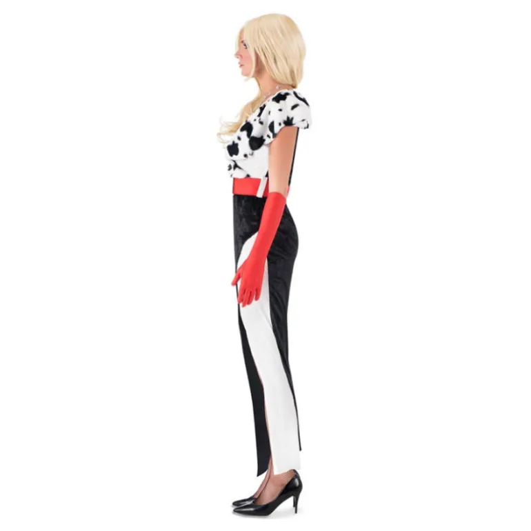 Transforma cualquier ocasión en un evento inolvidable con este **disfraz de villana cruel**. El **vestido** es largo y estilizado, combinando elegancia con un toque atrevido en colores **blanco y negro**, destacando un diseño que recuerda las icónicas manchas de piel. El escote en V y las hombreras ofrecen un aire de sofisticación, mientras que la **cintura** se resalta con un **cinturón rojo** que añade un toque de color vibrante a todo el conjunto.