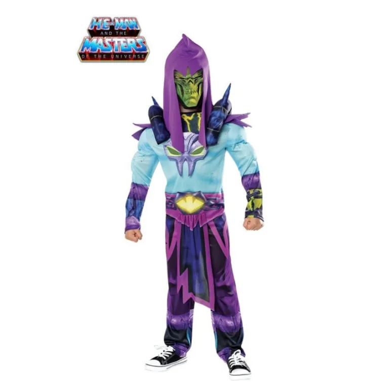 Transforma a tu pequeño en el icónico villano del universo de He-Man con este disfraz de Skeletor para niño. El conjunto incluye un jumpsuit con llamativos detalles en EVA, asegurando comodidad y una apariencia realista. La máscara, que completa el look, destaca por su diseño cuidado y colores vibrantes, recreando fielmente la temible expresión de Skeletor. Este disfraz se presenta en una combinación de tonos púrpura y azul con detalles amarillos, evocando la clásica vestimenta del personaje.