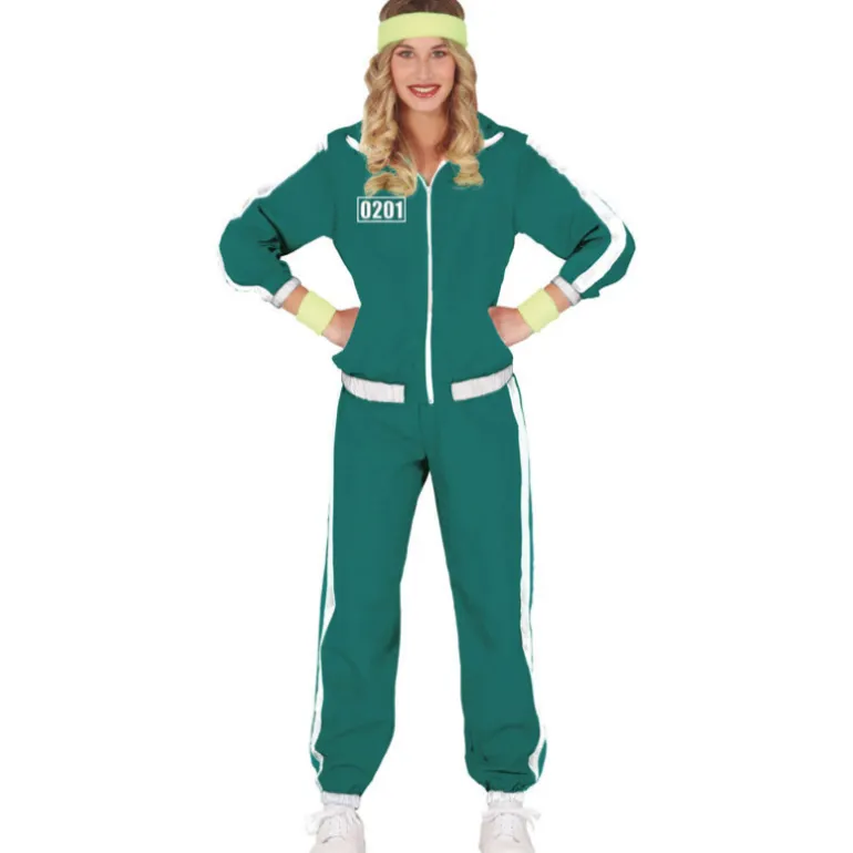 Se trata de un disfraz de gran calidad, que es una réplica del inconfundible chándal verde y blanco que llevaban todos los participantes de los juegos en la macabra serie, e incluye el conjunto de 2 piezas: chaqueta y pantalón.
