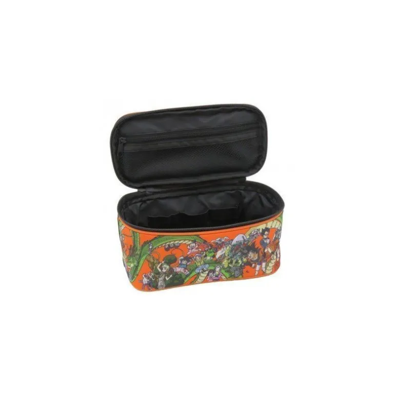 Un cómodo y práctico neceser con licencia oficial de Dragon Ball. Tiene forma muy cuadrada, con asa superior y unas medidas de 23 x 11 x 11 cm. Se abre con cremallera por la parte superior dejando a la vista todo el interior, donde hay varios compartimentos y otro bolsillo con cremallera.