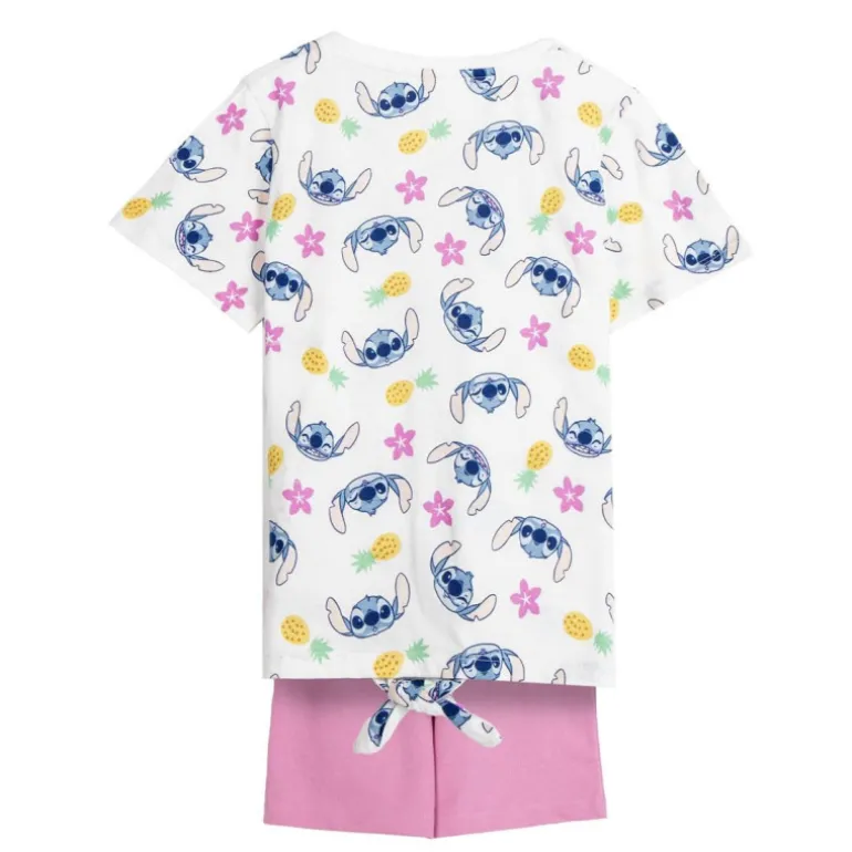 Descubre este conjunto de 2 piezas diseñado especialmente para los pequeños fanáticos de Stitch. La camiseta, hecha de 100% algodón, presenta un vibrante estampado del adorable personaje junto con coloridos detalles de piñas y flores en tonos amarillos y rosas sobre un fondo blanco. Perfecta para niños de 5 a 12 años, esta camiseta garantiza comodidad y estilo durante todo el día.